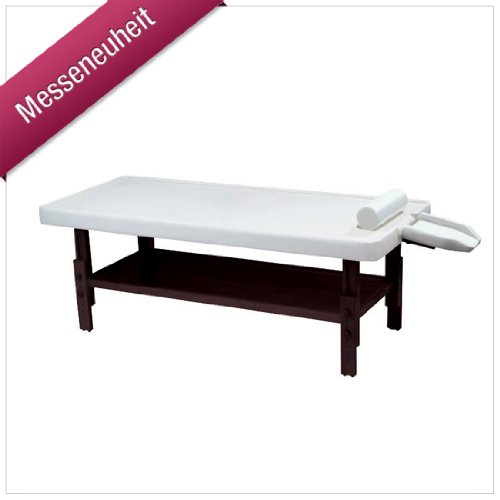 Massivholz-Liege mit variabler, höhenverstellbarer Arbeitsfläche Hautfreundlicher, ölresistenter Ultralederbezug Im Sinne der ayurvedischen Heilkunst perfektioniert Spezielle Kopfstütze mit seperatem Ablauf für ayurvedischen Stirnguss Umlaufende Kante verhindert unkontrolliertes Ablaufen bei Ölgüssen