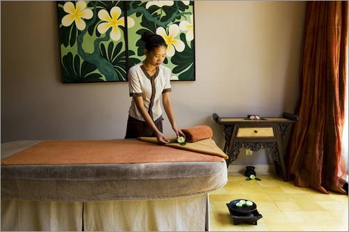 Poster 30 x 20 cm - "Frau arrangiert Massageliege im Visaya Spa" von Felix Hug / Lonely Planet Images - auch in anderen Größen Feature